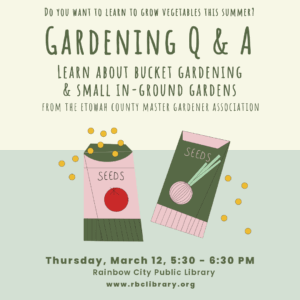 Do you want to learn to grow vegetables this summer? Learn about bucket gardening & small in-ground gardens from the Etowah County Master Gardener Association. Join us on Thursday, March 12 from 5:30-6:30pm.