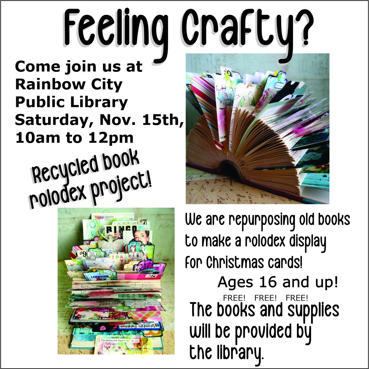 Join us on from 10:00am – 12:00pm on Saturday, November 15 to create your own recycled book rolodex. Ages 16 & up.  All materials will be provided.