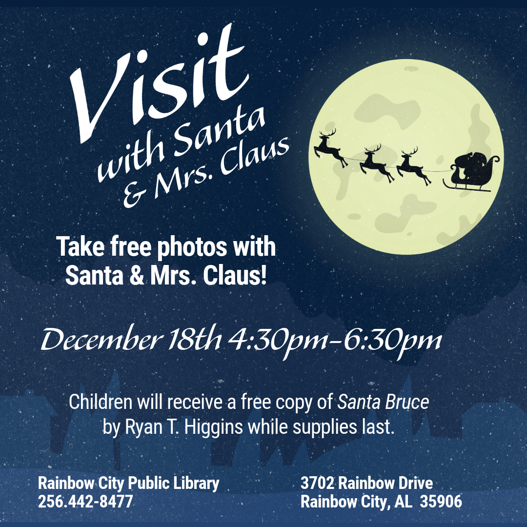 Santa & Mrs. Claus plan to visit Rainbow City Public Library on Thursday, December 18 from 4:30-6:30pm! Bring your children by the library to visit with them and take your own photographs. Children will receive a free copy of Santa Bruce by Ryan T. Higgins while supplies last!